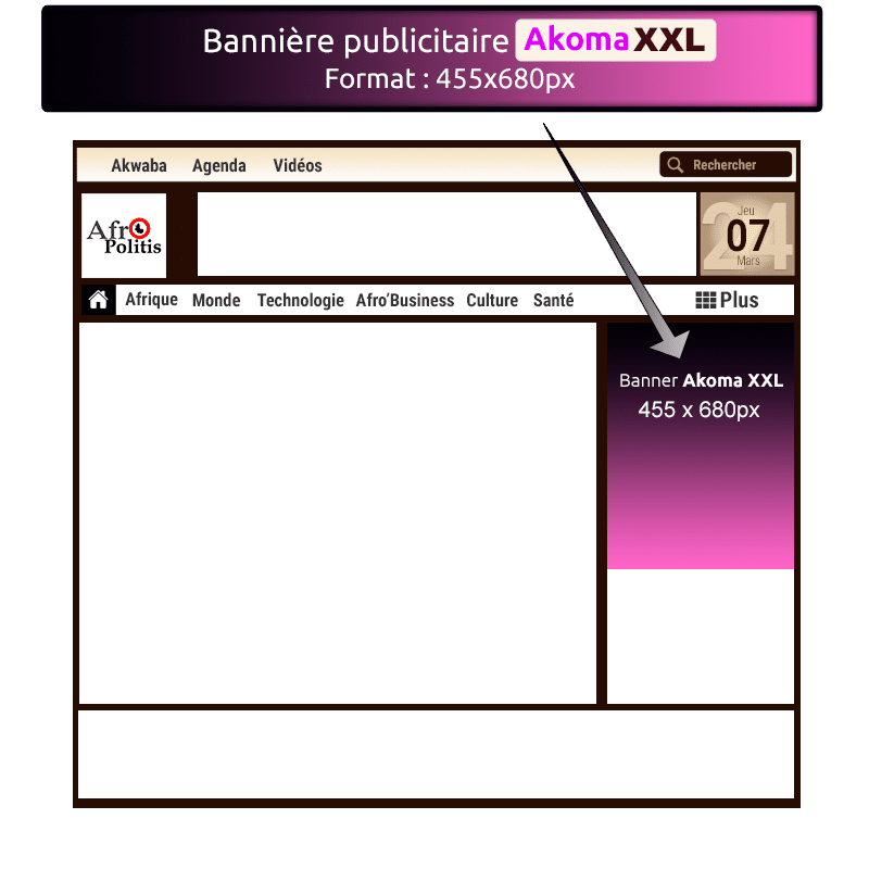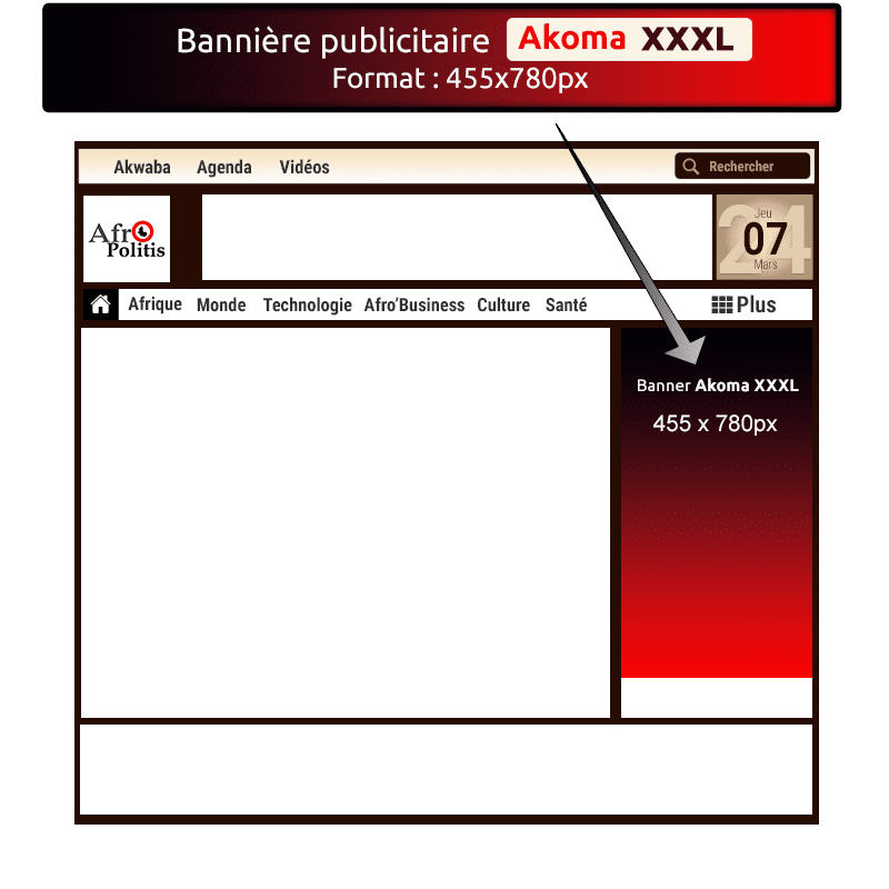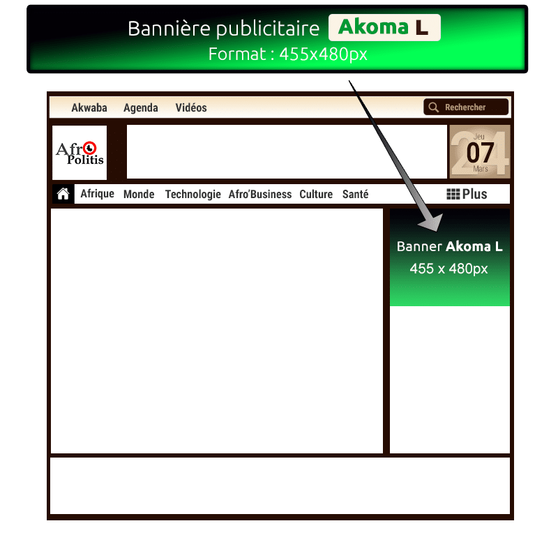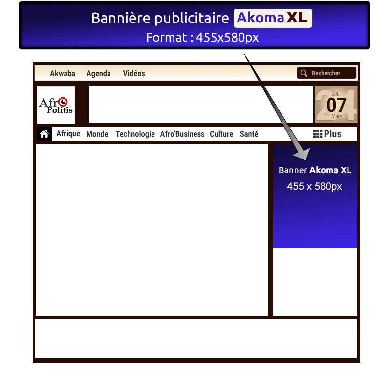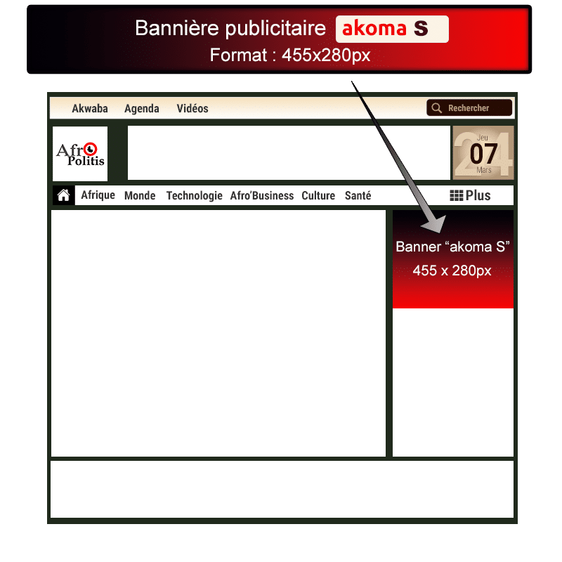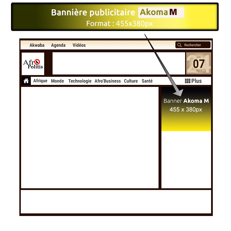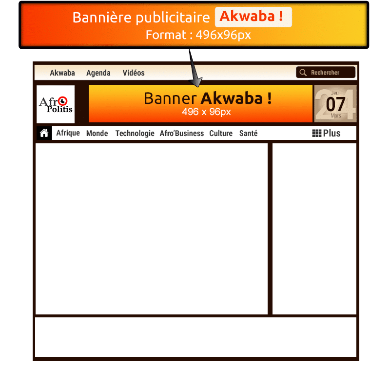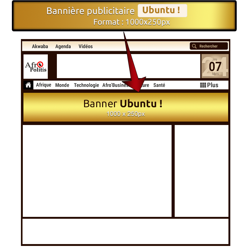 Retrouvez ci-dessous la liste de tous nos emplacements publicitaires disponibles à la commande sur le média AfroPolitis.com. En cliquant sur chaque offre de bannière publicitaire, vous découvrirez sa taille, son emplacement et son tarif, ainsi qu'un lien pour passer votre commande.